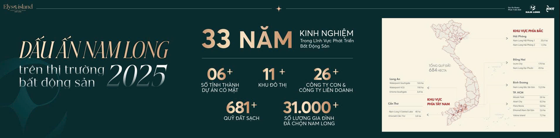 Mang tầm vóc quốc tế, Elyse Island là tâm huyết được phát triển dựa trên sự hợp tác giữa các nhà đầu tư uy tín: tập đoàn Nam Long 33 năm kinh nghiệm, NISHI – NIPPON RAILROAD – Nhật Bản trên 100 năm phát triển.