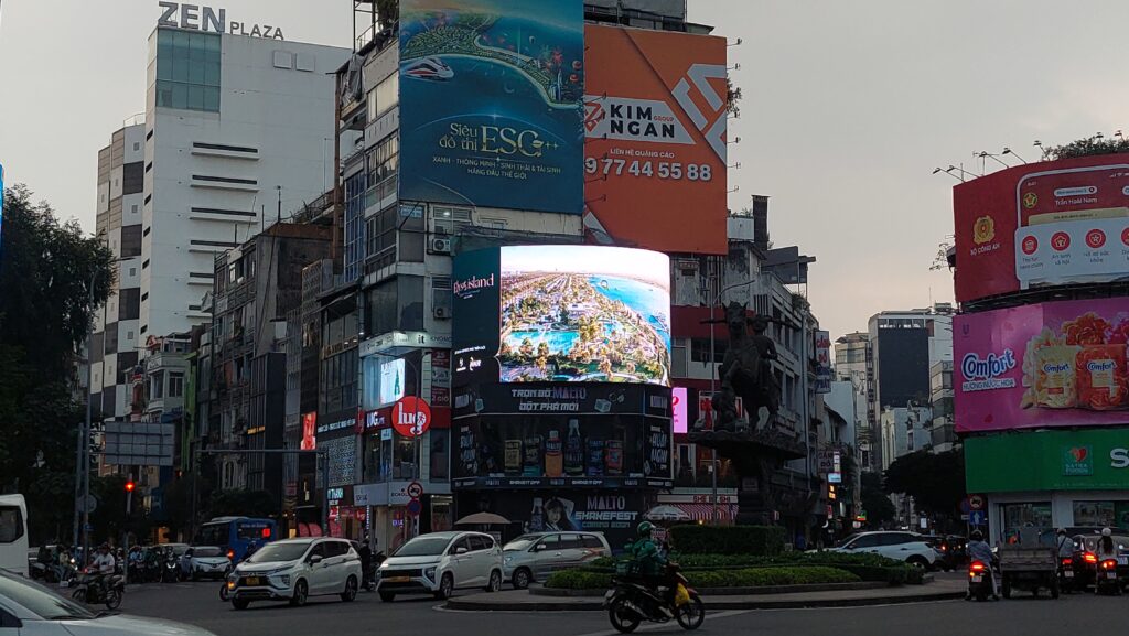 Xung quanh là những biển quảng cáo thương hiệu, những tòa nhà cũ – mới đan xen, biểu tượng cho quá trình phát triển liên tục của đô thị. Ở trung tâm vòng xoay, tượng đài sừng sững như chứng nhân của lịch sử, còn phía trên cao, những hình ảnh tương lai đang được trình chiếu bằng công nghệ hiện đại. Quá khứ – hiện tại – tương lai cùng tồn tại trong một khung hình.