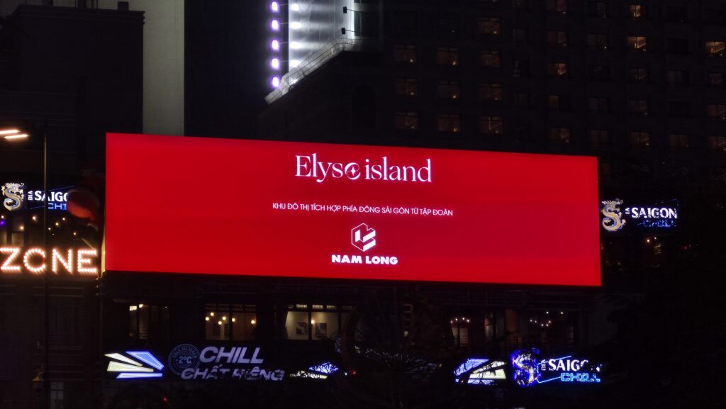 Giữa không gian ấy, màn hình quảng cáo nổi bật với hình ảnh Elyse Island như một lát cắt khác biệt. Không còn là nhịp vội vã của phố thị, Elyse Island hiện ra với gam màu xanh của nước, của bầu trời và những dãy nhà ven sông thanh bình. Sự đối lập ấy tạo nên ấn tượng mạnh: chỉ cách trung tâm vài chục phút di chuyển, một “thế giới khác” – yên tĩnh, riêng tư và gần gũi thiên nhiên – đang chờ đón.